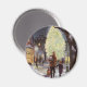 Ilustração Vintage Imagem de Natal feliz mostrando um pai tirando seus filhos comprando presentes e presentes na véspera de Natal. Uma grande árvore de Natal decorada branca está na praça da cidade. Um filho está sendo puxado para dentro de um trenó através da neve na calçada da cidade.