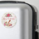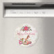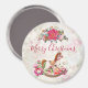 Um ímã de Natal festivo. O fundo é uma colagem de estilo vintage com uma imagem esmaecida de rosas rosa, folhas verdes e escrevendo francês. Camadas sobre o topo está um bonito buquê de natal de poinsettia e um cavalo de balanço vitoriano cercado de peônias e posições rosa bonito.