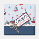 Cores náuticas em vermelho clássico, branco e azul com âncora e caranguejos e uma etiqueta de menino novidade com fio.