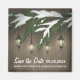 Casamento de Neve Evergreen Lanterna Salve os Amparos de Data - design apresenta um fundo de madeira rústica com lanternas balançando de uma neve coberta de cada galho verde de árvore. Consulte produtos correspondentes neste design encontrado na coleção nesta página.