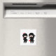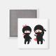 O adorável garoto ninja vestido de preto está esbranquiçado enquanto segura um coração de papel origami atrás de suas costas e olha para uma linda ninja, vestida de preto, mas para um arco rosa em cima de sua cabeça. A maçaneta da espada de katana também é cor-de-rosa.