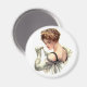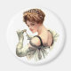 Uma jovem elegante está vestindo um vestido noturno, luvas compridas e tiara. Os pequenos óculos de ópera são guardados antes dela enquanto ela olha para trás.