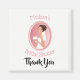 Ímã de agradecimento para festa de noivado. Desenhado com uma ilustração de uma noiva sorrindo segurando um buquê de flores em seu lindo vestido de noiva branco e usando um véu. Inserido em uma moldura oval rosa com uma borda rendada.