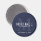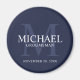 Adicione um toque pessoal ao seu casamento com um imã de padrinhos de casamento personalizado. Este ímã apresenta o nome de padrinho de casamento personalizado com título e data de casamento em branco e monograma em azul-marinho claro como fundo, no estilo serif clássico, em fundo azul-marinho. Também perfeito para o melhor homem, pai da noiva, porta-voz e muito mais.