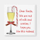 Belo ímã de Natal, com uma nota para os Papais noeis. Um copo de vinho festivamente decorado, com arco vermelho no caule e uma cana doce pendurada na borda decora este divertido ímã de férias. Uma nota bonita para os Papais noeis lê, Caros Papais noeis, estamos sem leite e biscoitos, espero que gostem disso. Personalize se quiser que o texto diga outra coisa.