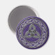 Uma Roda Celta Metálica Prateada feita de Nódulos e uma Trindade ou Triquetra representando corpo, mente e espírito. Em um fundo roxo brilhante.