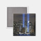 Nunca se esqueça, Lembrem-se das pessoas afetadas pela tragédia de 11 de setembro nas torres gêmeas do centro de comércio mundial em Nova Iorque. Esta fotografia (do DOD dos EUA) mostra as torres memoriais de luz em azul neon brilhante torcendo sobre os arranha-céus da cidade da linha escura da noite e luzes onde os prédios estavam. Apoie a ocasião e mostre o seu cuidado e preocupação como cidadão Patriótico dos EUA.