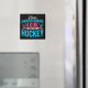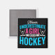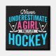 Texto rosa-quente, azul-claro, e branco com punhos de hóquei e bastões de hóquei lê Nunca Subestime uma Menina que Joga Hóquei, excelente para o jogador de hóquei de todas as idades que ama o esporte!