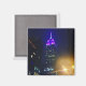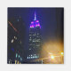 Features an original color photograph of the Empire State Building, lit in purple, at night. Photographed in New York City.