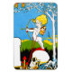 Pequeno personagem de desenho animado loiro, tipo cupido, com asas e grandes calçados vermelhos balançando seu arco enquanto parado sobre um crânio. Ilustração do cartunista italiano Antonio Rubino, do cobrir de Maggiolata, 1906.