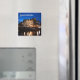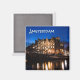 Foto-ímã de Souvenir com as antigas casas românticas da cidade de Amsterdã, construída ao longo do canal de Prinsengracht, com reflexo das luzes na água tranquila no início da noite na capital da Holanda com o texto 'Amsterdã'.