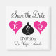 O casamento de Las Vegas salve o ímã de encontro com corações cor-de-rosa neon. Design de monograma personalizado com iniciais de noiva e noiva e data de casamento. Rei monograma e rainha de corações. Poker jogando trajes, corações e espadas.
