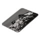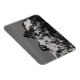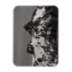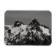 Uma fotografia a preto e branco de dois picos na Faixa Tatoosh conhecida como O Castelo e o Pinnacle. A cordilheira está coberta de neve apesar de ser verão. Há árvores e pedras espalhadas sobre a paisagem e as montanhas. A posição do sol permite que sombras sejam lançadas na montanha. As nuvens incógnitas adoram o céu. Imagem Copyright ©2023 Kimberly J Tilley. zazzle.com/store/developingnature