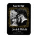 Anuncie seu grande dia com corajoso talento gótico usando este cartão até a morte Salve a data. Projetada com um fundo preto dramático, uma intrincada estrutura de deco de arte dourada e um casal de maquiagem de esqueleto impressionante, esta carta é perfeita para casais planejando um casamento de Halloween, romance gótico ou celebração de alternativos. Personalize com seus nomes e data de casamento por uma perseguição elegante que estabelece a palco para seu dia especial. Par com convites e artigos de festa de noivado para uma suíte de casamento gótica completa.