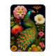 Magnet com pavão colorido e uma variedade de flores encantadas. Pintura digital botânica em estilo Haeckel moderno.