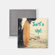 Fotografia de um velho prato de surfe inclinado contra uma palmeira em Hole, na Fence Beach, Califórnia.