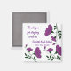Você está procurando uma maneira única de receber seus convidados e colocar seu aluguel de férias fora de sua competição? Este ímã quadrado apresenta flores roxas brilhantes que sopram e curvam seu caminho ao longo do ímã de geladeira. O púrpura brilhante das flores é complementado pelas folhas e caules verdes escuros. "Obrigado por ficar conosco" junto com o nome da sua casa e as informações de contato podem ser facilmente personalizadas para atender às suas necessidades.