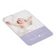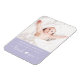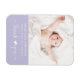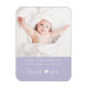 Um simples e doce obrigado de bebê que você anuncia o anúncio de nascimento mantendo o íman que apresenta a foto de sua menina recém-nascida, o nome, a data de chegada e o estado de nascimento é a moderna tipografia branca contra um fundo púrpura pastel e o "obrigado você" escrito em um roteiro branco com um coração juntando as duas palavras.