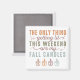 Este humorístico e aconchegante design de outono apresenta a frase espirituosa "A única coisa que fica no final de semana são minhas velas de queda" em uma mistura de fontes ousadas e elegantes. O texto é organizado criativamente com diferentes tamanhos e estilos de fonte, adicionando interesse visual e um tom lúdico. A paleta colorida inclui tons quentes de outono, como laranja queimada, verduras terríveis e castanhos macios, que evocam o calor e conforto da estação.