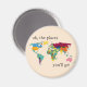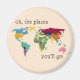 Um belo ímã com um mapa do mundo colorido e as palavras 'oh, os lugares que você vai' para o seu pequeno mapa.