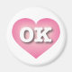 Este ímã apresenta um coração calmo, legal e colecionado cor-de-rosa com um centro lavado em branco contendo as letras negrito, branca, maiúsculas OK, a abreviação oficial para Oklahoma, o estado mais rápido.
