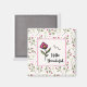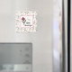 Um ímã com um quadro quadrado e uma borda cor-de-rosa, dentro diz "Olá Linda" escrito em uma letra de moda com uma linda linha cintilante acima do texto. Também uma bonito flor-tronco, longa e rosa, com folhas verdes ao lado. O pano de fundo é um padrão uniforme, com flores silvestres rosa desenhadas à mão, com caules longos e folhas verdes sobre um fundo branco de casca de ovo. Círculos cor-de-rosa e galhos também decoram o design. Design floral bonito e bonito.