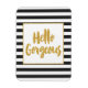 Bela citação moderna e elegante de tipografia pincel script. "Olá Lindíssimo". Apresentando uma moldura de brilho metálico dourado e letras douradas com listras pretas e brancas.