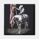 Uma bela fotografia da vaquinha num palomino e cavalo de pintura branco segurando a bandeira americana durante o Hino Nacional no Stampede do Rio Cobra de 2014.