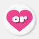 Este ímã apresenta um coração cor-de-rosa-quente vibrante contendo as letras maiúsculas em negrito, branco, arredondado ou, uma abreviação lúdica para o estado de Oregon, o estado do castor.