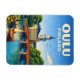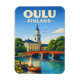 Bring a touch of Finnish charm to your home with this vibrant Oulu, Finland magnet. Featuring a classic vintage-style illustration of the city's riverside landmark and historic bridge, this design captures the serene spirit of the North. It is a perfect small keepsake to remember your trip to Finland or to add a splash of Nordic color to any magnetic surface.