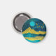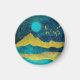 design de paisagem da montanha abstrato em tons de ouro, ciano e azul em tons negros, com um nascer, estrelas e pássaros.