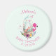 Íman personalizado para um chá de fraldas ou outro evento. Projetado com uma ilustração de uma aquarela fofa de um ovo sentado dentro de um cesto de vime. Decorados com fitas, arcos, flores e pequenos corações também. Um flamingo cor-de-rosa e coelho branco ficam de lado a lado a observar a carga do precioso.