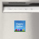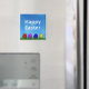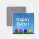Ilustração de felz pascoa com ovos coloridos pintados de Páscoa na grama com o céu azul no verso e tipografia "Felz pascoa" escrita com nuvens brancas.
