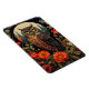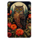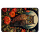 A flexible magnet with a cool looking owl with a piercing stare. A full moon in the back with a garden of red flowers.