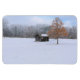 neve coberta de pinca com galpão e árvore cercada por floresta