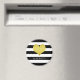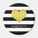 Imã de geladeira de cozinha com um elegante coração de folha de ouro falso em um padrão de listras preto e branco e impressão de nome personalizado. A decoração de casa está disponível.