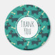 Um obrigado que o seu ímã desenhou com um padrão repetitivo que apresenta um bonitinho sorriso com orelhas de disquete e um osso de cão. Fundo verde.