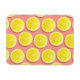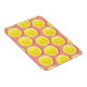 Um padrão de fatias de limão frescas e suculentas em tons claros e vívidos de amarelo, com uma textura aquosa que lhe dá aquele aspecto recém cortado. Eles são colocados sobre um fundo cor-de-rosa de salmão para um visual brilhante e de verão, como uma limonada rosa.