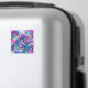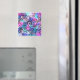 Um passarinho engraçado no canto superior esquerdo e elementos florais num fundo rosa, roxo e turquesa.
