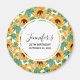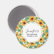 Íman de aniversário com um padrão de verão bonito. Bonito girassóis amarelos cercados por folhas verdes em um padrão repetitivo. Um círculo por cima com um dentro de texto personalizado.