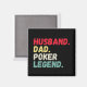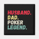 Ele está orgulhoso de três títulos: marido, pai, lenda de pôquer. Em uma fonte retrorreflectora angustiada em branco e azul amarelo-vermelho, que forma excelente de mostrar suas conquistas em um ímã engraçado. Um presente único para um pai e marido que ama pôquer, jogos de cartas e família.