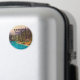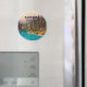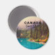 Um ímã com uma fotografia cênica da paisagem canadense. Um lago cor de turquesa com uma floresta de pinheiros ao fundo e um céu nebuloso nebuloso que lhe dá uma qualidade mística mágica.