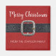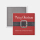 Papai noel preto com fivela prateada no terno de veludo vermelho. Feliz Natal em letra branca e uma mensagem pessoal em letra branca.