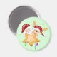 Papais noeis e a nossa rena vermelha favorita a espreitar por trás de uma estrela de Natal com luzes de férias coloridas penduradas.