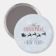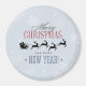 Um imã de natal festivo. Uma cinza sutil com flocos de neve. Rico com letra de tendência que diz: Feliz Natal e Feliz ano novo. Com uma silhueta preta de papais noeis cavalgando em seu trenó sendo puxado por sua rena voando pelo céu.