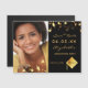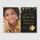 Na frente: Adicione sua própria foto vertical do formando. Um fundo preto chic, decorado com estrelas douradas falsas. Personalize e adicione um nome e data. Letras douradas. O nome e o texto: Save the Date são escritos com um estilo de letra manuscrita moderno.