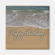 Belo oceano azul com ondas brancas e praia arenosa e Feliz Aniversário na letra do roteiro.
