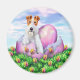 Celebrar a Páscoa com esta eclosão de Fio Fox Terrier a partir de um ovo colorido com tulipas coordenadas crescendo ao redor.