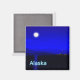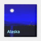 Moonrise na passagem de Dentro do casaco do Alasca. Montanhas à distância e um barco de pesca dirige-se para norte. A leitura de texto "Alaska" aparece em azul e branco brilhantes.
