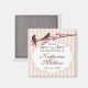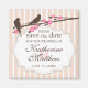© 2011 Designs socialitas. Nosso elegante imã anúncio de casamento salva-a-data tem um par de pássaros em um galho florescente silenciado contra um fundo listrado de coloração de peônia. Sua área de texto será limitada com ambas as cores da nuvem prateada e prateada. A cor do texto é atualmente a mesma que os pássaros. Você precisa de ajuda para personalizar? Por favor, não hesite em contactar-me com os seus requisitos.